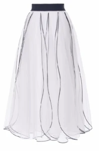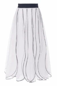 The romantic petal-layered long dress effortlessly creates a whimsical atmosphere.